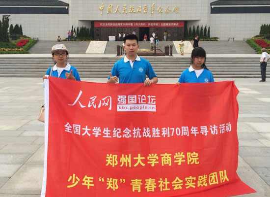 7月16日,鄭州大學(xué)“少年鄭青春”暑期實(shí)踐隊(duì),開展了“緬懷革命先烈,樹立信心實(shí)現(xiàn)中國夢”實(shí)踐活動。團(tuán)隊(duì)通過抗戰(zhàn)知識調(diào)研、參觀抗戰(zhàn)紀(jì)念館、采訪抗戰(zhàn)老兵、向幼兒園孩子普及抗戰(zhàn)知識等方式紀(jì)念抗戰(zhàn)勝利70周年。