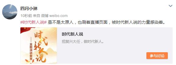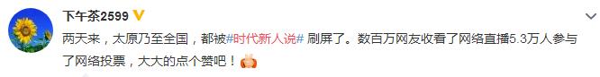 #時(shí)代新人說(shuō)#微博話(huà)題下不乏這樣的留言:“太原乃至全國(guó),都被‘時(shí)代新人說(shuō)’刷屏了”、“雖不是太原人,也刷著直播頁(yè)面,被時(shí)代新人說(shuō)的力量感染著”。
