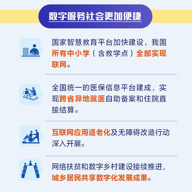 與此同時,《報告》介紹,在數(shù)字服務(wù)社會方面,國家智慧教育平臺加快建設(shè),我國所有中小學(xué)(含教學(xué)點(diǎn))全部實現(xiàn)聯(lián)網(wǎng)。全國統(tǒng)一的醫(yī)保信息平臺建成,實現(xiàn)跨省異地就醫(yī)自助備案和住院直接結(jié)算;ヂ(lián)網(wǎng)應(yīng)用適老化及無障礙改造行動深入開展。網(wǎng)絡(luò)扶貧和數(shù)字鄉(xiāng)村建設(shè)接續(xù)推進(jìn),城鄉(xiāng)居民共享數(shù)字化發(fā)展成果。