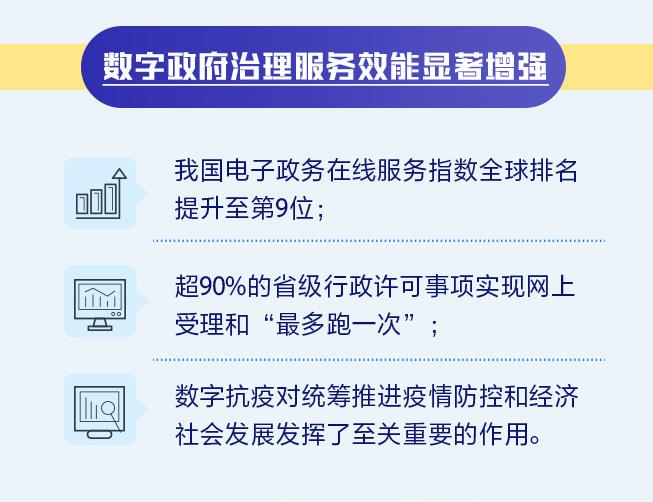 《報告》顯示,我國數(shù)字政府治理服務(wù)效能顯著增強(qiáng)。我國電子政務(wù)在線服務(wù)指數(shù)全球排名提升至第9位;超90%的省級行政許可事項實現(xiàn)網(wǎng)上受理和“最多跑一次”;數(shù)字抗疫對統(tǒng)籌推進(jìn)疫情防控和經(jīng)濟(jì)社會發(fā)展發(fā)揮了至關(guān)重要的作用。