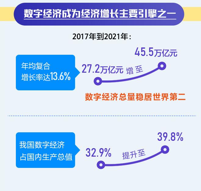 《報告》顯示,2017年到2021年,我國數(shù)字經(jīng)濟(jì)規(guī)模從27.2萬億增至45.5萬億元,總量穩(wěn)居世界第二,年均復(fù)合增長率達(dá)13.6%,占國內(nèi)生產(chǎn)總值比重從32.9%提升至39.8%,成為推動經(jīng)濟(jì)增長的主要引擎之一。
